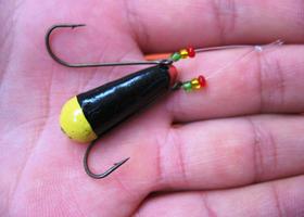 Колір яєць може бути різним – від яскраво-жовтого до чорного. Це, звичайно, залежить від особистих переваг рибалки та конкретних умов лову. Ловіть у місці зі світлим дном – використовуйте більш темне забарвлення, з темним дном – світлішу. Я особисто віддаю перевагу поєднанню жовтого і чорного кольору з червоними намистинками.